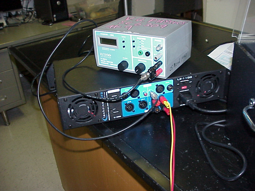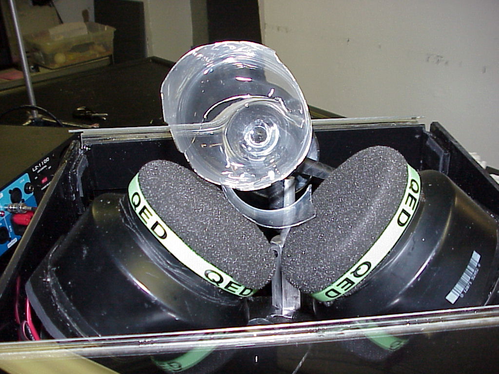 InstructionsA.) The resonant frequency of the glass should have been predetermined and written on bottom of glass. When a vigorous standing wave of four loops and nodes on the rim of the glass is viewable (under room lighting) from the adjustment of the function generator , then modest sound pressure levels (less than 100 db) seem to suffice to trigger structural failure of the glass. 533 to 540 Hz seems to be a good number for white wine glasses from Libby