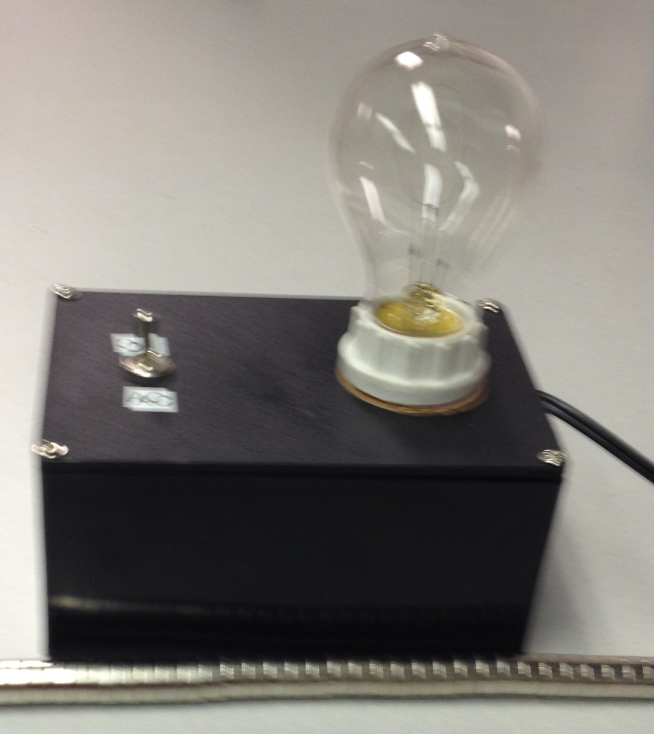 Demo DescriptionThe toggle switch on the device can be set to send either AC or DC current through the specially shaped filament in the light bulb.One can bring a magnet near the filament and observe its behavior in each case. The vibration in the filament (in the AC case) can cause it to break, so its probably best not to bring the magnet too close to it. |