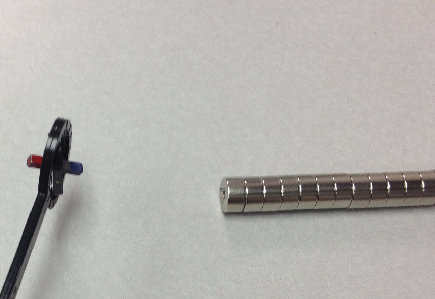 The figure shows the magnaprobe detecting the magnetic field of a neodynium magnet. Move the magnaprobe around near any configuration of magnets to help students visualize the magnetic field in 3D. Writeup by Sourish DuttaCopyright © 2015, Vanderbilt University. All Rights Reserved. |