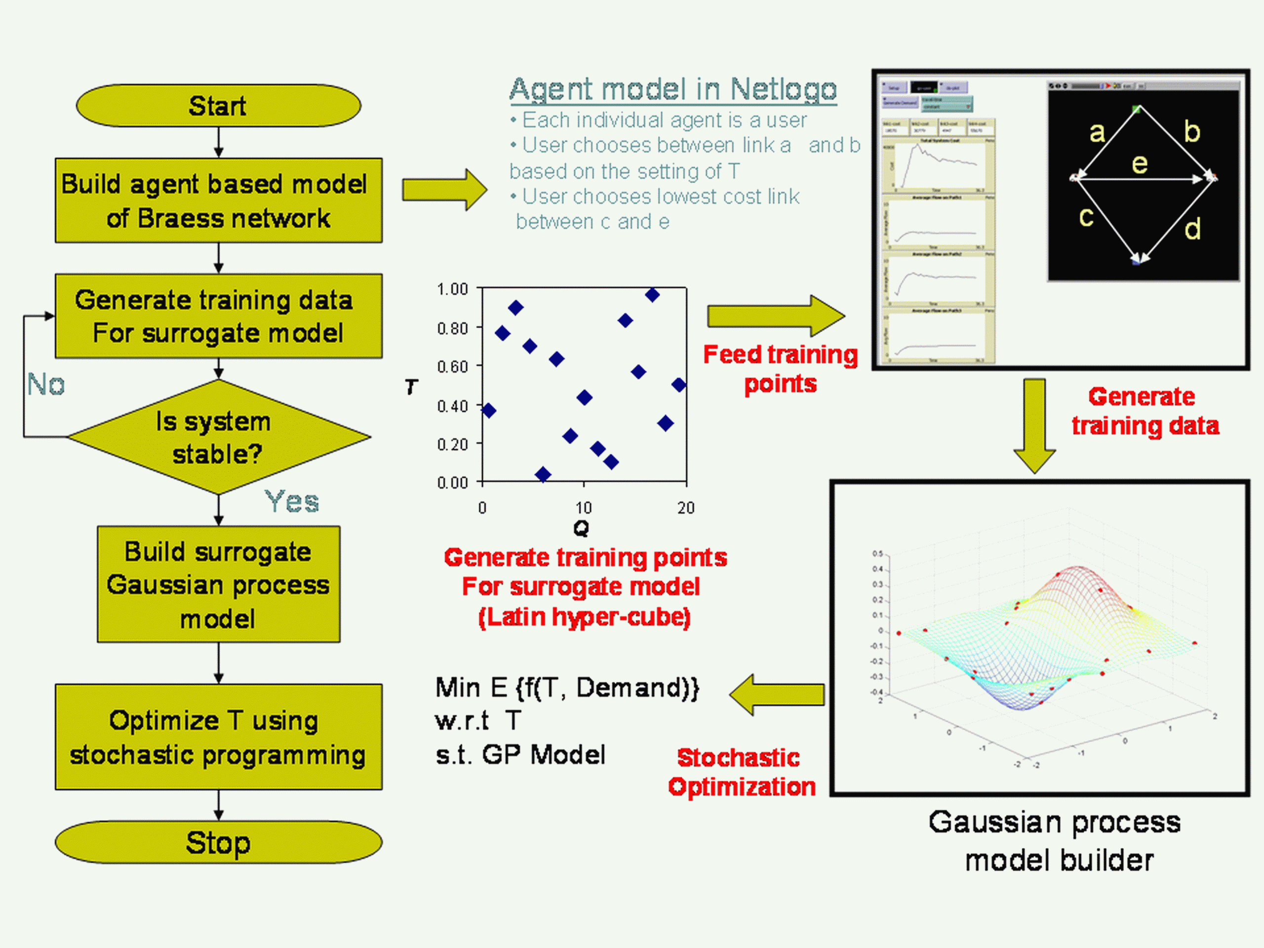 Designing policies for real-world network-based systems with complex and dynamic system architectures and heterogeneous user populations is a difficult problem. Successful policy design requires simultaneous consideration of qualitative factors as well as quantitative measures, linking physics of the system behavior in terms of constitutive, design, manufacturing, and environmental variables, along with reliability and uncertainty considerations. A methodology for policy design in networked systems is presented. Agent-based modeling is integrated with stability analysis of dynamic systems, and optimization under uncertainty. The methodology is illustrated using a transportation network benchmark problem. Additionally bounded rational behavior of individual users are considered and modeled as software agents within a discrete time simulation framework. Largest Lyapunov exponent is used to identify the stability characteristics of the network system and a Gaussian process model is constructed as an inexpensive surrogate for the agent-based model. The Gaussian process model is then used within an optimization framework facilitating computational efficiency in policy optimization under uncertainty.