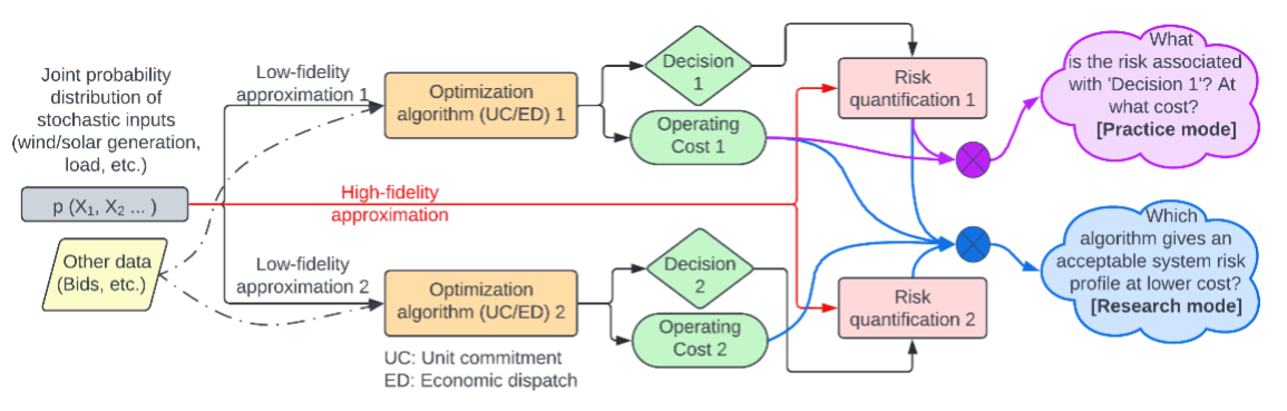 Stochastic optimization (SO) methods provide a viable alternative for managing the risk in the power grids with increasing stochasticity. However, these methods have not been adopted by operators due to the lack of trust, unavailability of rigorously validated probabilistic forecasts, and high computational cost of executing these algorithms. Our work seeks to bridge these gaps by (i) developing methods to quantify the risk associated with a given decision in a clear and efficient manner to build trust in new optimization tools; (ii) developing and rigorously validating probabilistic forecasting models that learn the joint distribution of the stochastic variables; and (iii) exploring dimension reduction approaches to ease the computational burden of SO.