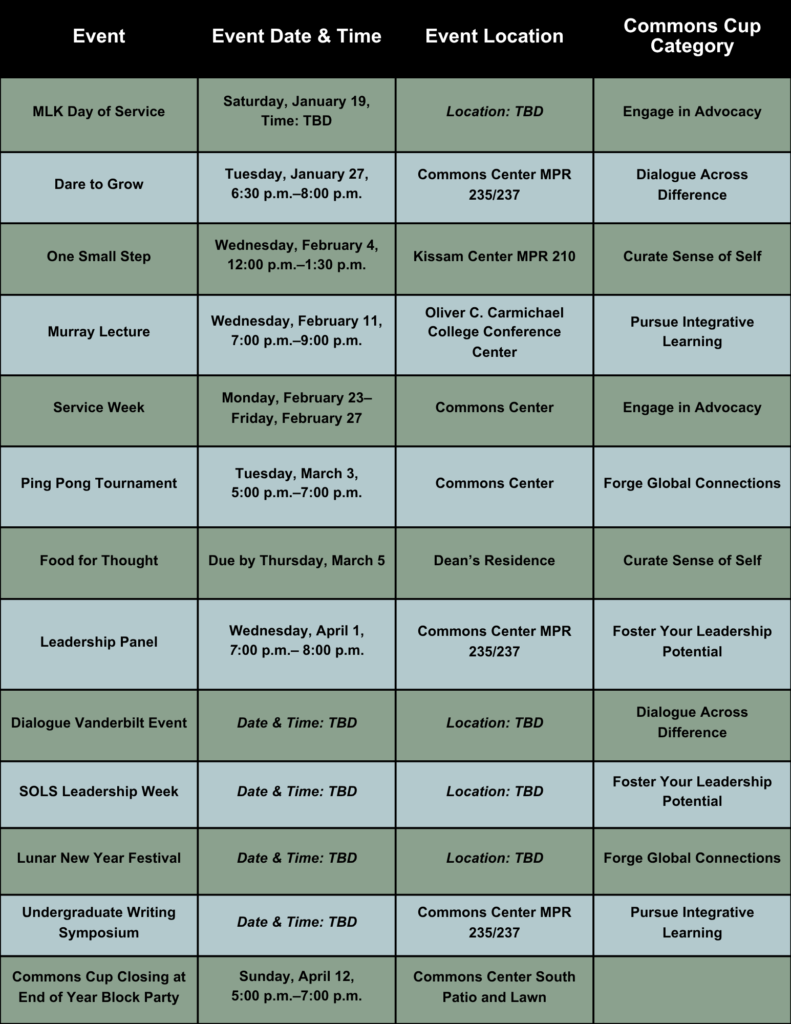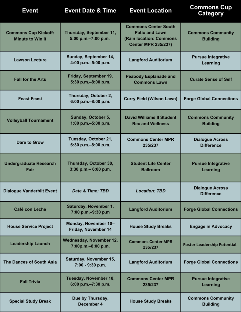 The Commons Cup is a first-year tradition intended to promote social and academic acculturation to Vanderbilt University and integration of each first-year class through house competition and Commons-wide community engagement.
