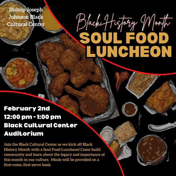 Audience: Open to allJoin the Black Cultural Center as we kick off Black History Month with a Soul Food Luncheon! Come build community and learn about the legacy and importance of this month in our culture. Meals will be provided on a first-come, first-serve basis.