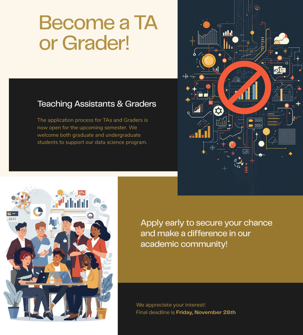 as a few positions open for Spring 2026 and is looking for excellent candidates to fill these last remaining roles. TA and grader positions are available for some of the most high-demand and compelling data science courses on campus: