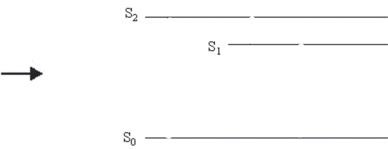 In the figure a simplified energy-level diagram for either an atomic or molecular species is shown. Such a species forms the basis for the laser gain medium. For the unexcited species, the electrons are in the ground state, S0. When energy is pumped into the gain medium the electrons can be excited to a higher energy level, S2.