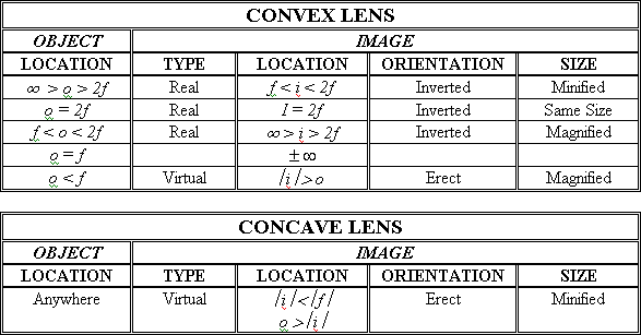 Based on the location of the object relative to the focal point the location, size and type of image will vary for a positive or negative lens.