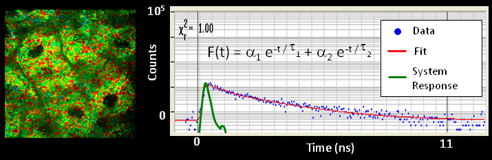 In fluorescence lifetime imaging, the color-coded value of each pixel in an image represents the mean fluorescence lifetime of all the fluorophores in that pixel. The fluorescence lifetime is determined by counting all the photons that arrive at the detector into discrete time bins. After detecting many photons, a decay curve emerges that is fit to a multi-exponential decay (after accounting for the finite time response of the system). The decay constants of this fit (tau) are the lifetime components of the pixel of interest.
