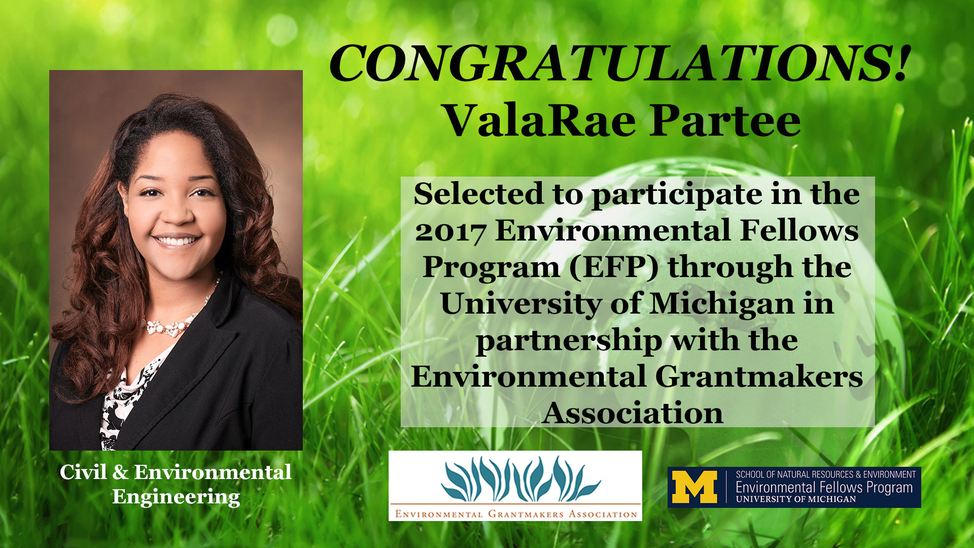 Graduate Student ValaRae Partee was selected to participate in the 2017 Environmental Fellows Program (EFP) through the University of Michigan in partnership with the Environmental Grantmakers Association.