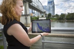 Janey Camp’s tablet shows a map that displays an example of a Nashville flood analysis for the downtown area near the Cumberland River.— Michelle Morrow | The Ledger