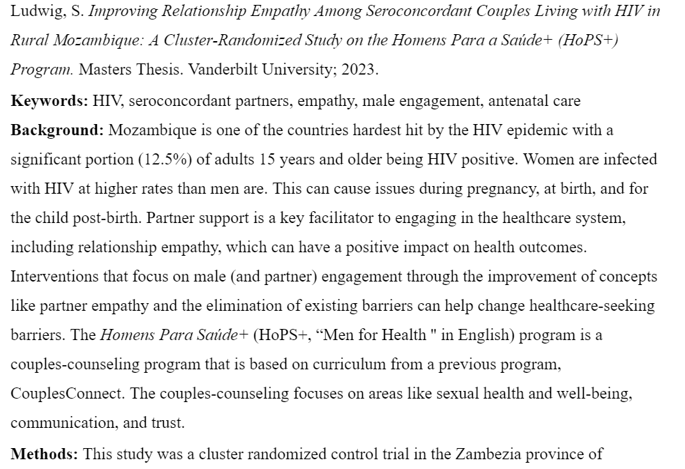 Improving Relationship Empathy Among Seroconcordant Couples Living with HIV in Rural Mozambique: A Cluster-Randomized Study on the Homens Para a Saúde+ (HoPS+) Program |