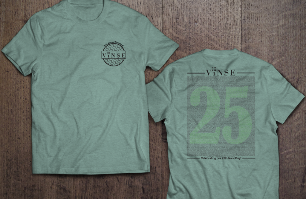 This year’s 25th NanoDay marks a milestone in VINSE’s history and we’re celebrating with a special commemorative T-shirt designed by Sarah Ross and Owen Meilander, recipients of the 2025 NanoDay tshirt design award and $300 cash prize.