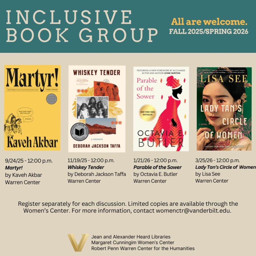 A partnership between the Margaret Cuninggim Women’s Center, the Jean and Alexander Heard Libraries, and the Robert Penn Warren Center for the Humanities, the Inclusive Book Group encourages Vanderbilt community members to read expansively, even beyond their comfort zone.