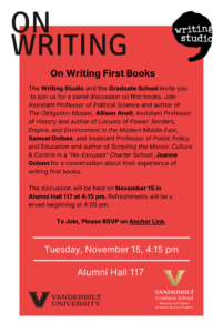 The Writing Studio and the Graduate School invite you to join us for a panel discussion on first books. Join Assistant Professor of Political Science and author of The Obligation Mosaic, Allison Anoll; Assistant Professor of History and author of Locusts of Power: Borders,Empire, and Environment in the Modern Middle East, Samuel Dolbee; and Assistant Professor of Public Policy and Education and author of Scripting the Moves: Culture & Control in a “No-Excuses” Charter School, Joanne Golann for a conversation about their experience of writing their first book.